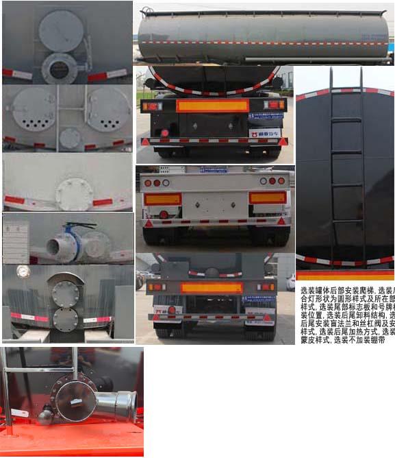 該車為非?;愤\(yùn)輸車輛,不能運(yùn)輸?;?罐體有效容積:34.5立方米,允許運(yùn)輸介質(zhì)的最大密度為:900千克/立方米,罐體為鵝頸式,該車加裝保溫層,保溫層厚度為50mm和80mm兩種,當(dāng)外形尺寸長(zhǎng)(mm)為:10400時(shí),保溫層內(nèi)部罐體外形尺寸型為(mm):長(zhǎng)9800,寬2350,前端高1900,后端高2080,;當(dāng)外形尺寸長(zhǎng)(mm)為:9800時(shí),保溫層內(nèi)部罐體外形尺寸型為(mm):長(zhǎng)9300,寬2350,前端高1900,后端高2080;ABS系統(tǒng)生產(chǎn)廠家:廣州瑞立科密汽車電子股份有限公司,梁山順安達(dá)汽車科技有限公司,廣州市西合汽車電子裝備有限公司,山東梁山德?tīng)柛F嚳萍加邢薰?型號(hào):CM2XL-4S/2M,SAD-ABS4S/2M,XH-GQ4S2M-E01,DEF-ABS4S/3M;側(cè)面及后下部防護(hù)裝置所用材料材質(zhì)均為:Q235,側(cè)面防護(hù)裝置與車輛連接方式為:螺栓連接,后下部防護(hù)裝置與車輛連接方式為:焊接,后部防護(hù)裝置的主要尺寸參數(shù):斷面尺寸(mm)為120×68,離地高度為:500mm;選裝閥門(mén)箱及個(gè)數(shù)(一個(gè)或兩個(gè)),選裝罐頂升降護(hù)欄,選裝罐體后部安裝爬梯,選裝后組合燈形狀為圓形樣式及所在部件樣式,選裝尾部標(biāo)志板和號(hào)牌板安裝位置,選裝后尾卸料結(jié)構(gòu),選裝后尾安裝盲法蘭和絲杠閥及安裝樣式,選裝后尾加熱方式,選裝外蒙皮樣式,選裝不加裝繃帶,選裝走臺(tái)樣式,選裝罐口位置,選裝外觀樣式,選裝后尾加裝爐個(gè)數(shù);車長(zhǎng)/牽引銷到車輛最前端距離/軸距/后懸的對(duì)應(yīng)關(guān)系為:9800/1200/4630+1310+1310/1350,10400/1400/4930+1310+1310/1450,10400/1250/5080+1310+1310/1450. |
